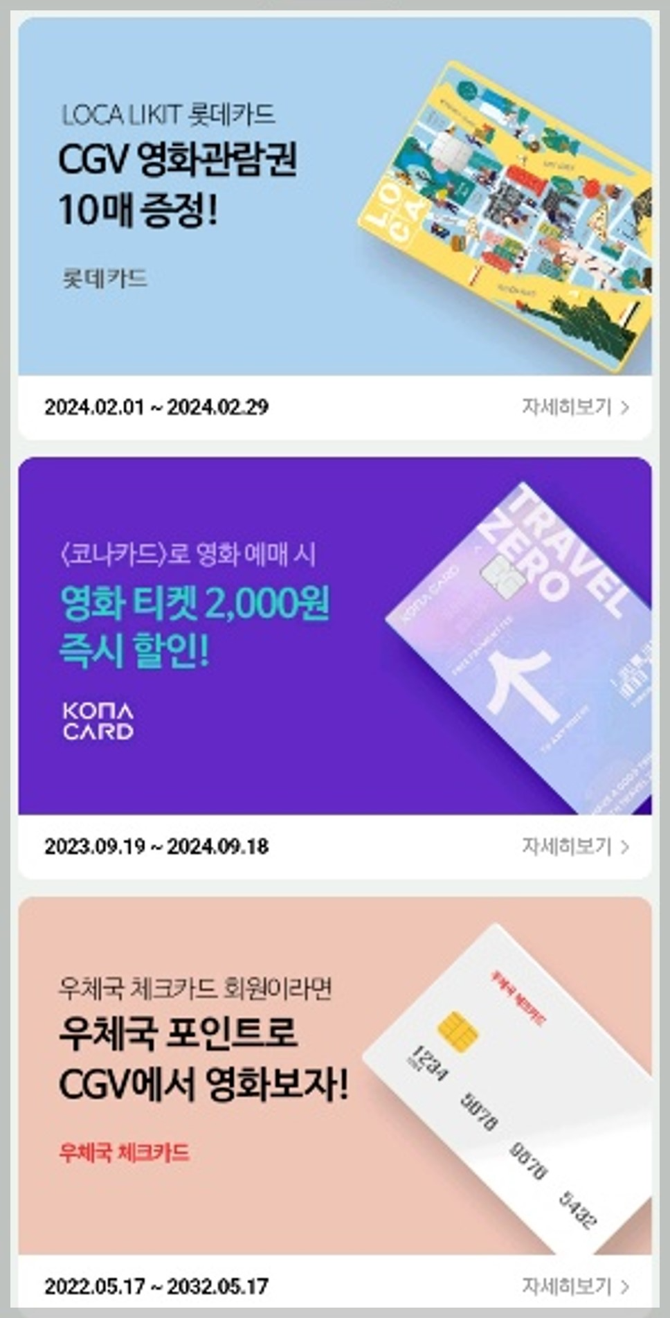 할인 대상 신용카드는 매달 변경되기 때문에 CGV 홈페이지에서 확인이 필요합니다. 현재는 LOKA LIKIT 롯데카드, 코나카드, 우체국 체크카드 등을 사용하면 할인받을 수 있습니다.