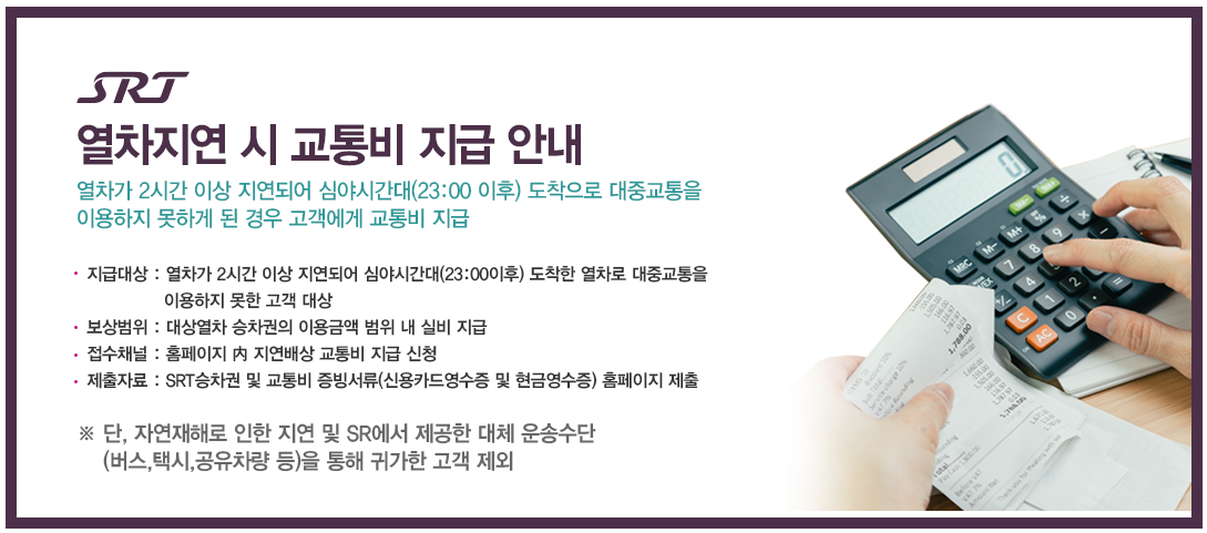SRT는 지연배상금과는 별개로, 열차가 2시간 이상 지연되서 밤 11시 이후 도착한 열차로 인해 대중교통을 이용하지 못한 고객에게 교통비를 지급합니다.