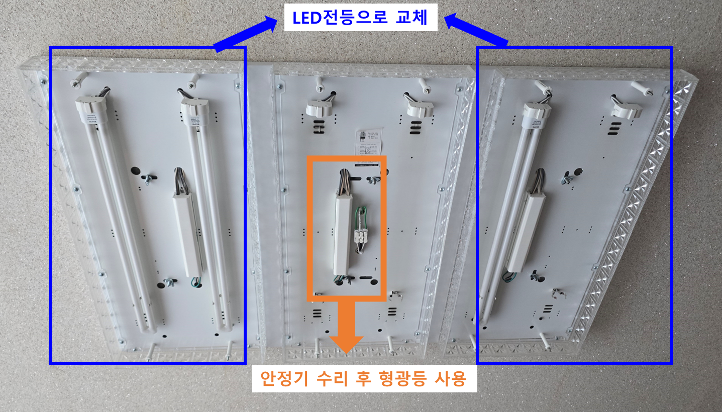 LED전등으로 교체하고, 가운데 전등의 안정기까지 수리를 완료했습니다.
