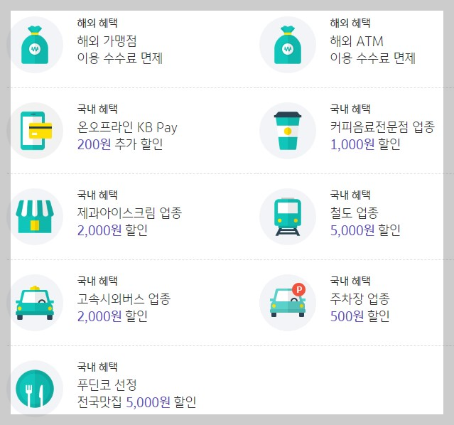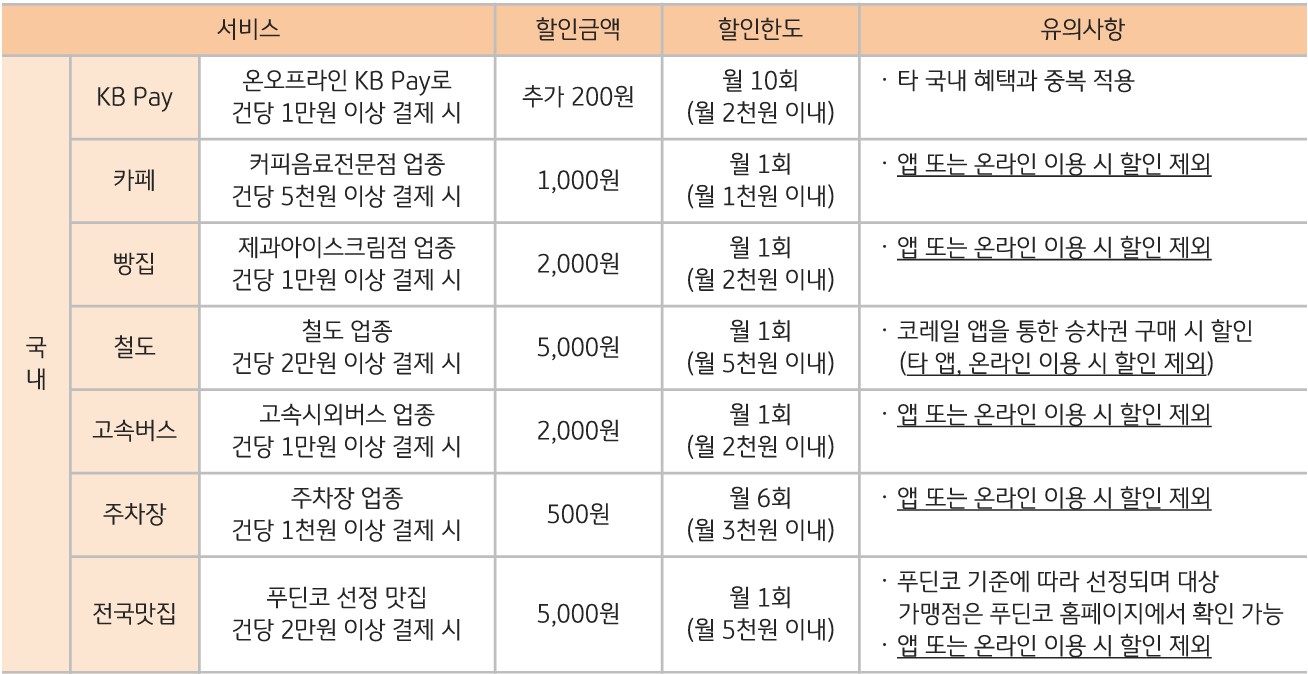 KB국민 트래블러스는 해외여행카드로는 이전에 출시된 카드들과 비슷한 혜택을 제공할 뿐이지만, 국내 혜택이 다양한 편입니다.