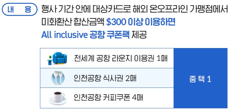 5월 31일까지 해외 온오프라인 가맹점에서 미화로 환산했을 때 합산 $300 이상 결제하면 공항 쿠폰팩을 제공합니다.
