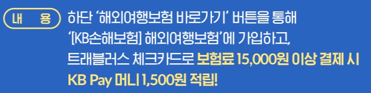 6월 30일까지 이벤트 배너를 통해 KB손해보험 해외여행보험에 가입하면 보험료 15,000원 이상 결제 시 KB Pay 머니 1,500원이 적립됩니다.