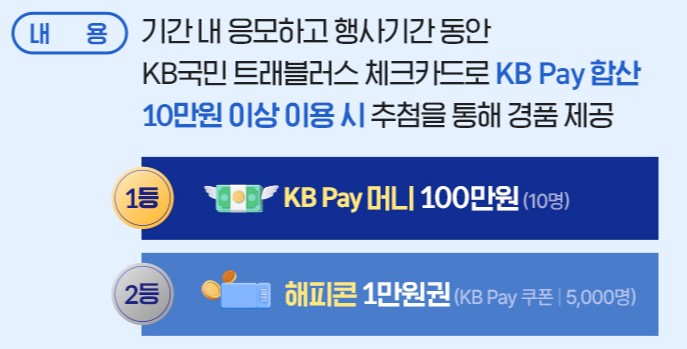 5월 31일까지 트래블러스 체크카드 신규 발급 후, 6월 15일까지 KB Pay로 2만원 이상 이용 시 2만원이 도로 캐시백됩니다.